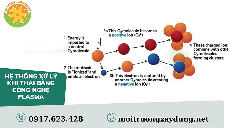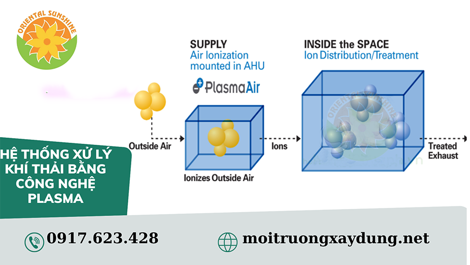 Khí thải sẽ được đưa qua một màng lọc bụi thông qua hệ thống quạt hút. Khí sau khi đã lọc bụi tiếp tục đi qua buồng plasma. Hệ thống sử dụng nguồn điện xoay chiều một pha được tăng điện áp (lên đến 3.000 Volt). Điện thế cao được tạo bởi ống plasma kết hợp với luồng không khí tạo ra các ion O2+ và O2–, cụm ion phân tử này có khả năng oxy hóa, phân tử VOC và các chất ô nhiễm.